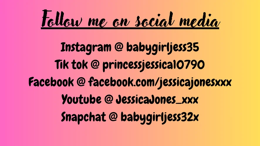 If you want to keep up to date with what I got going on, follow me on my social media. I appreciate all the support! Instagram @ babygirljess35 Tik tok @ princessjessica10790 Facebook @ facebook.com/jessicajonesxxx Youtube @ JessicaJones_xxx Snapchat @ babygirljess32x